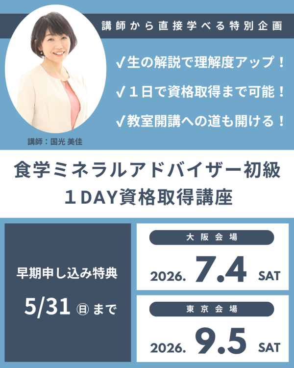 国際食学協会でトップクラスの人気を誇る「食学ミネラルアドバイザー初級 1day資格取得講座」の対面開催が決定いたしました!